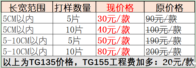 1)长宽在5CM以内打样5片 仅需:30元/款全国包邮!