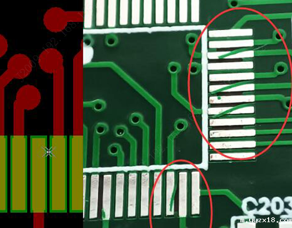 挂桥(阻焊桥挂在焊盘上)影响高多层板的焊接。实际做出来的情况如下: