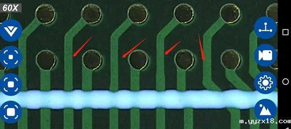 yyzx18超高精LDI对位技术,让设计来得更为简单。对于焊盘中间走线:高精准的对位,焊盘开窗基本上等同于焊盘的大小,让你的走线在焊盘中穿插更加高效、简单。不用担心开窗层上走线,从而影响产品性能。如图: