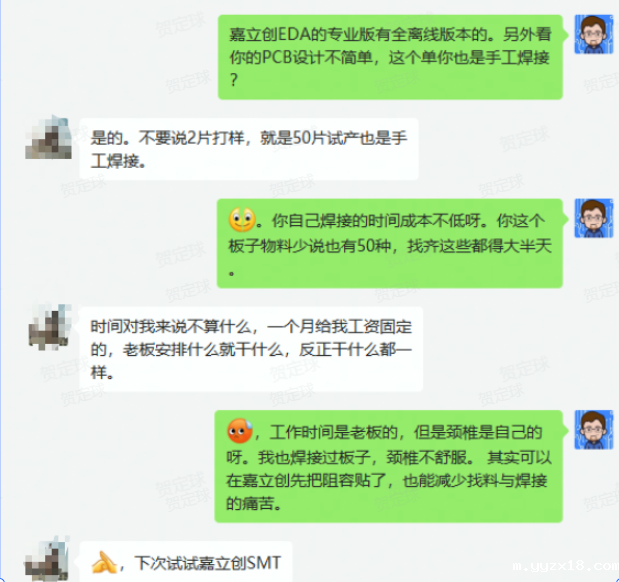 yyzx18SMT的初心就是想解决工程师样品焊接的难题,最近我们与一个工程师聊天,又有颇多感触。