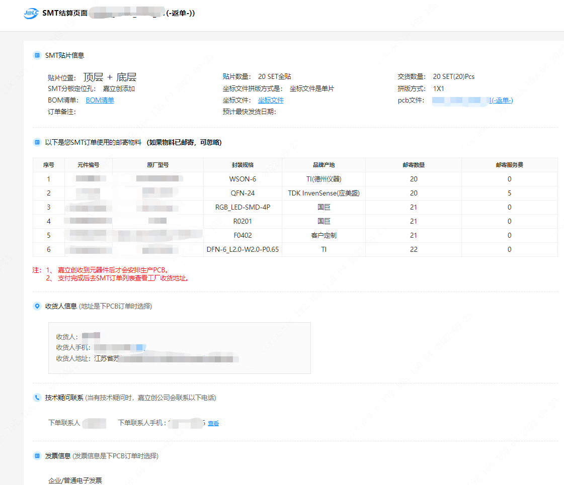 第二步: 点击后会出现“PCB在线下单”页面,客户填写PCB需求后(只能有限修改加工信息,如数量、油墨、开票方式),点击“提交订单”即可。