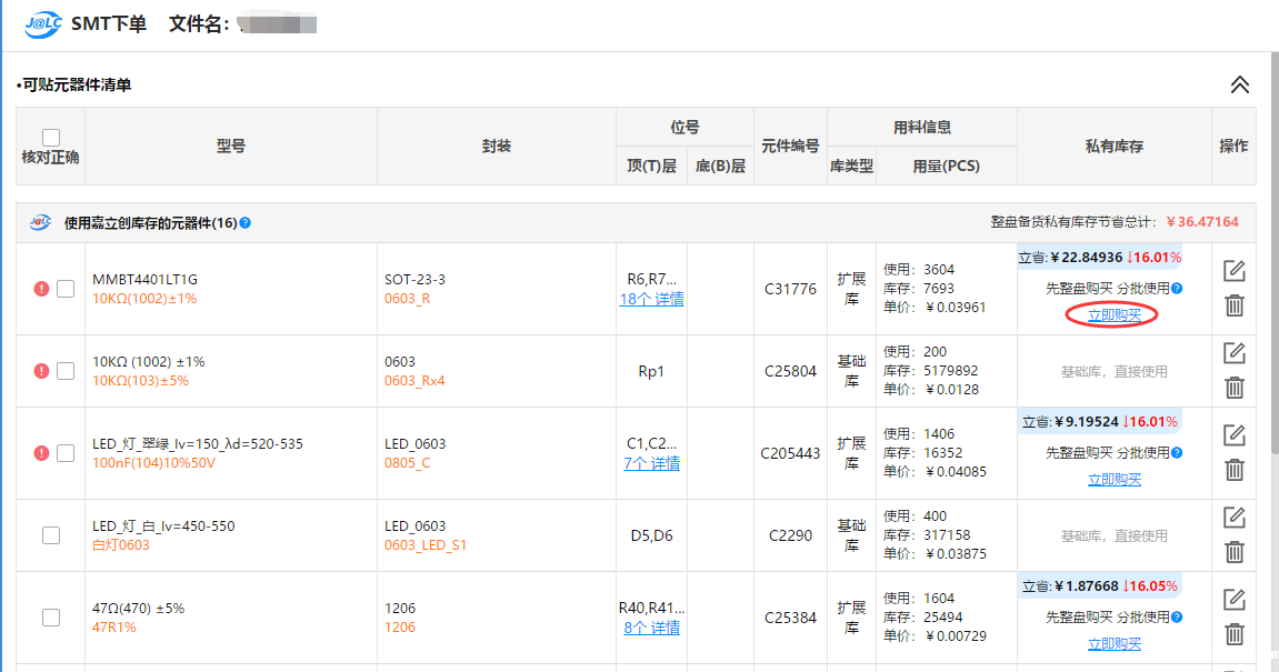 6.对于购买的器件,在"SMT贴片加工"---"私有/可贴库存管理"---"我的元器件库存"---”元器件购买记录“内进行查看。