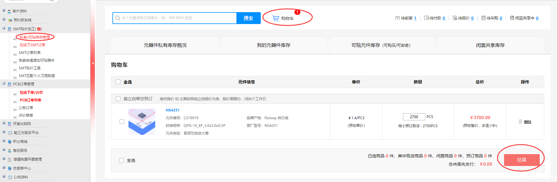 3.加入购物车后,可以在"SMT贴片加工"---"私有/可贴库存管理"内的点击"购物车"内,勾选需要购买的订单.,点击"结算"按钮。