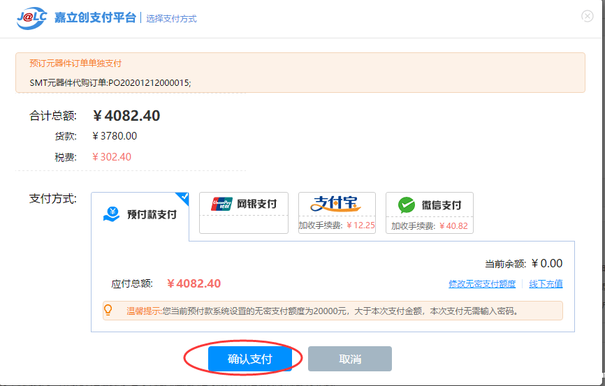 5.确认支付,对于购买的现货,在付款后,下单即可选用;对于预订的器件,需要在采购入库后,才可以下单选用。