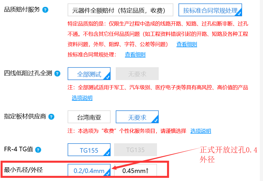 5:2019年9月1号 又迈出重要的一步,正式开放高难度加工工艺:0.4的过孔外径,0.2的内径 加工 开放,又给大家了一个新的选择