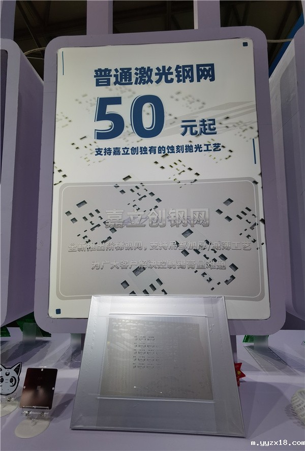 阶梯钢网在钢网行业所占据比例并不大,很多客户可能都没有听说过阶梯钢网。作为钢网行业的高端产品,阶梯钢网可以有效的控制焊盘的上锡量,使其更贴合焊接要求。制作阶梯钢网的条件要求也非常高,yyzx18统一采用进口钢片制作,蚀刻线需经过反复调试蚀刻厚度以达到客户加厚/减薄的要求。展会现场我们带来了加厚及减薄两种工艺的钢网,为客户提供了更有力的讲解。