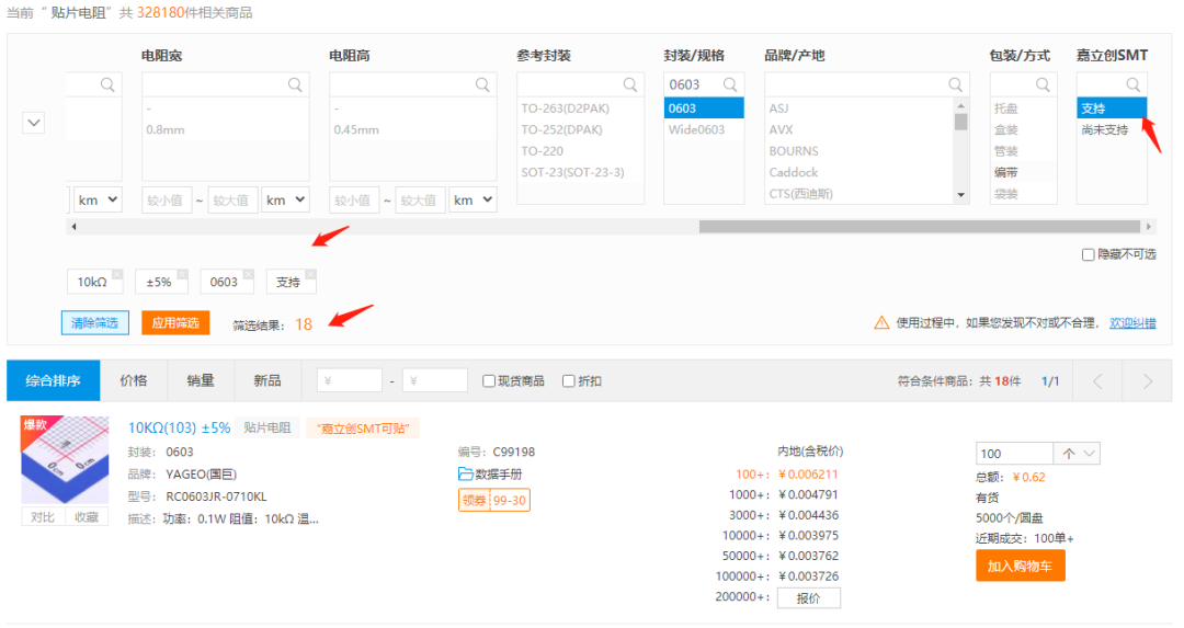 2、通过参数筛选,快速选择一个10K 5% 0603 的可贴电阻,筛选结果总共有18种,总有一种能满足你的需求!
