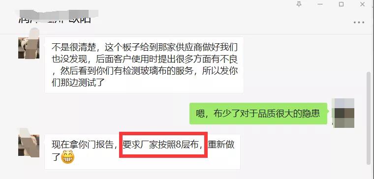 3)客户给予了 “免费板材质量检测服务”高度的认可,在跟进的过程中,很多客户根本就不清楚板材型号,对于本要用8张布却用了6张布这种偷换概念的套路行为表达了极度的愤怒!!!甚至6张布板材已经影响到了板子质量的性能,严重的会导致元器件全部损失,可见6张布的危害隐患极大!而事先不告知客户偷布减料则属于欺骗行为,悔不当初太信任啊!