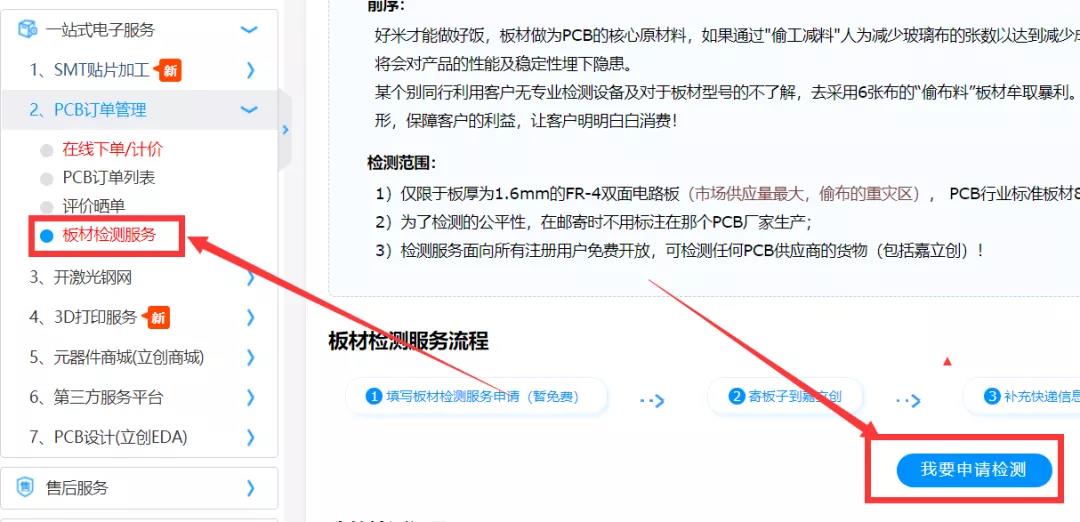 进入 下单系统→ 左侧菜单栏找到“板材检测服务”→ 点击“我要申请检测” ,然后按流程就能完成板材检测啦~