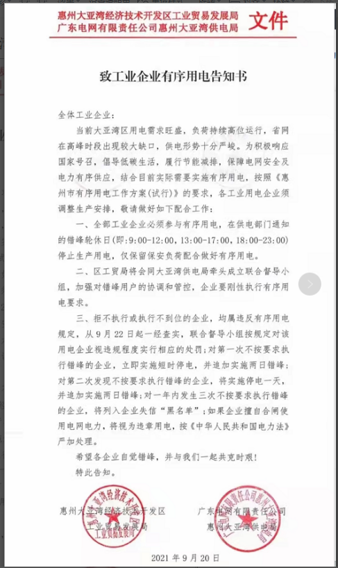 受持续高温影响,目前电力供应紧张,连续接到惠州、珠海两市工厂要求错峰用电的通知,错峰用电将对 所在地区的工厂造成一定的交期影响, 因有多个生产基地,我们将尽最大的努力把影响降到最低,可能受限电的影响交期比普通交期长2~3天左右,恳请各位客户对目前交期规划尽量多一些时间,感谢您的理解与支持!