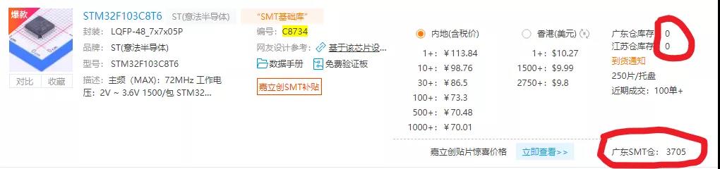 也许元器件有优惠还不够优秀,为了更好的满足贴片需求,在这个缺货的时代, 把很多热门的物料给SMT做了特殊供应,优先保障SMT的使用,甚至只允许SMT使用。比如 热门的STM32F103C8T6 已经无库存可以销售,但是SMT还有10多盘。