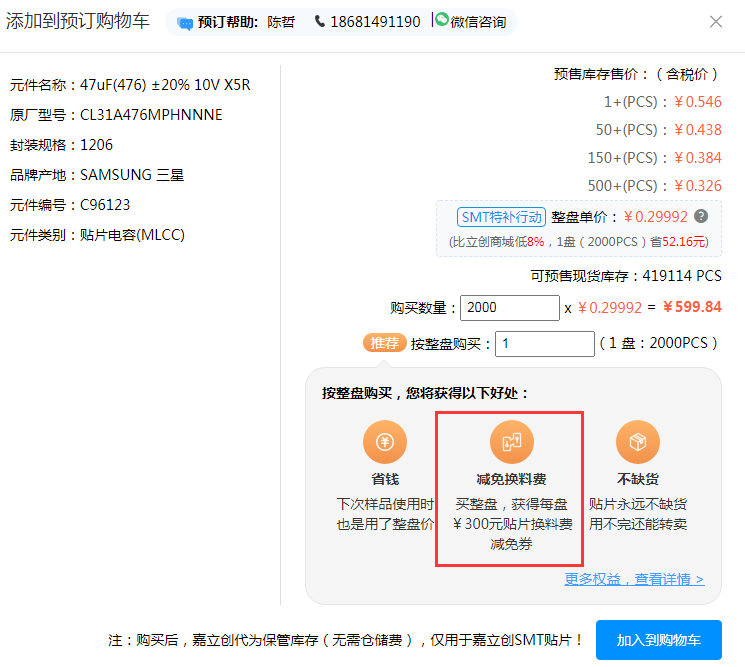 只要整盘购买、整盘预订器件,此器件即 送 300元 换料费减免券,下SMT订单时使用指定器件,立即减免换料费