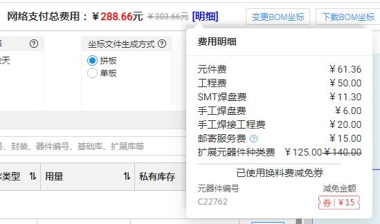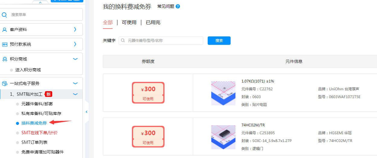 下SMT订单时,如果您有用到换料费减免券对应的元器件,会自动为您选择使用