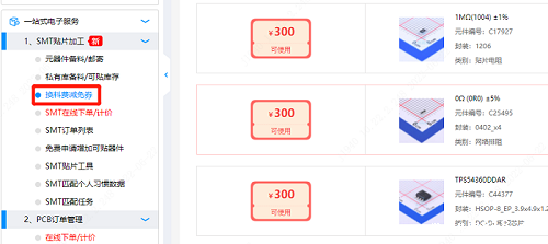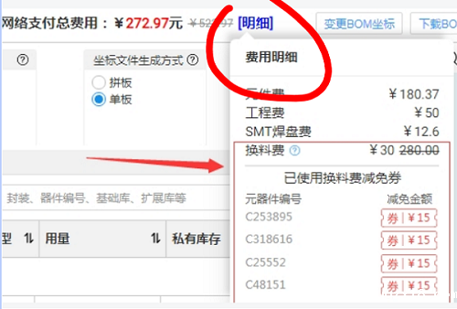 订单使用到整盘购买的器件,会自动减免换料费,通过【费用明细】可以详细查看使用的减免券。