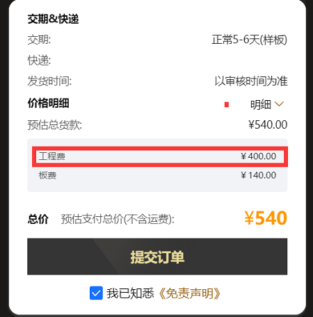 工程费:样板及小批量工程费从200元调整到了150元,直接下降50元。