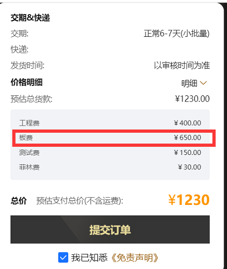1、8层板的特价(长宽在10CM以内、打样5片):仅需600元,加上100左右的沉金费,也只需要706元。