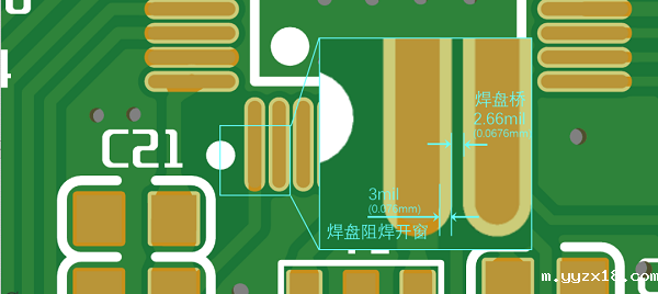 举例讲解:原设计是这样,焊盘阻焊开窗单边焊盘大于3mil,导致阻焊桥只有2.66mil,就很容易出现掉桥、挂桥情况。如图: