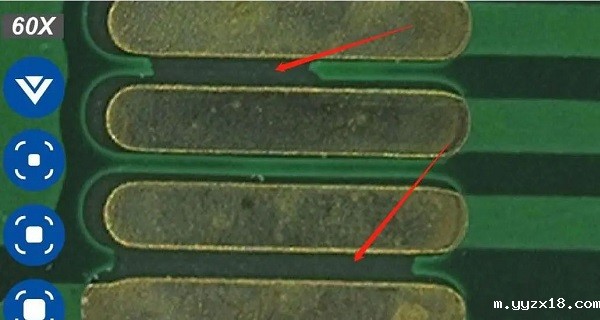 yyzx18超高精LDI对位技术,让设计来得更为简单。对于焊盘中间走线:高精准的对位,焊盘开窗基本上等同于焊盘的大小,让你的走线在焊盘中穿插更加高效、简单。不用担心开窗层上走线,从而影响产品性能。如图: