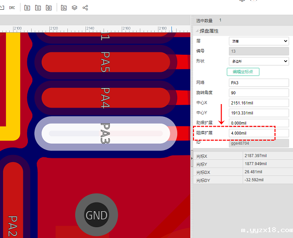 yyzx18EDA标准版是由封装库决定,封装库中设置了每个焊盘的扩展值。