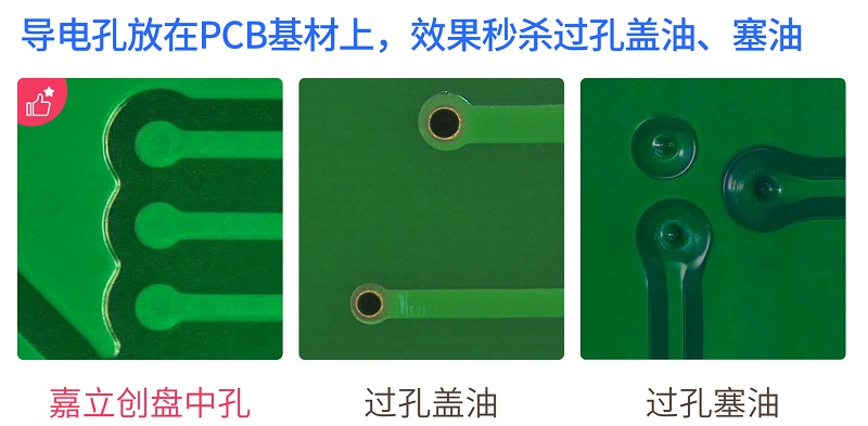 如果设计时过孔没有放在焊盘上, 盘中孔生产工艺的性能及效果也秒杀“过孔盖油”和“过孔塞油”。它既解决了过孔盖油孔口发黄的问题,也解决了过孔塞油因容易冒油而引起的SMT焊接性能不良的问题。当然外观上看更是惊艳,对比图如下: