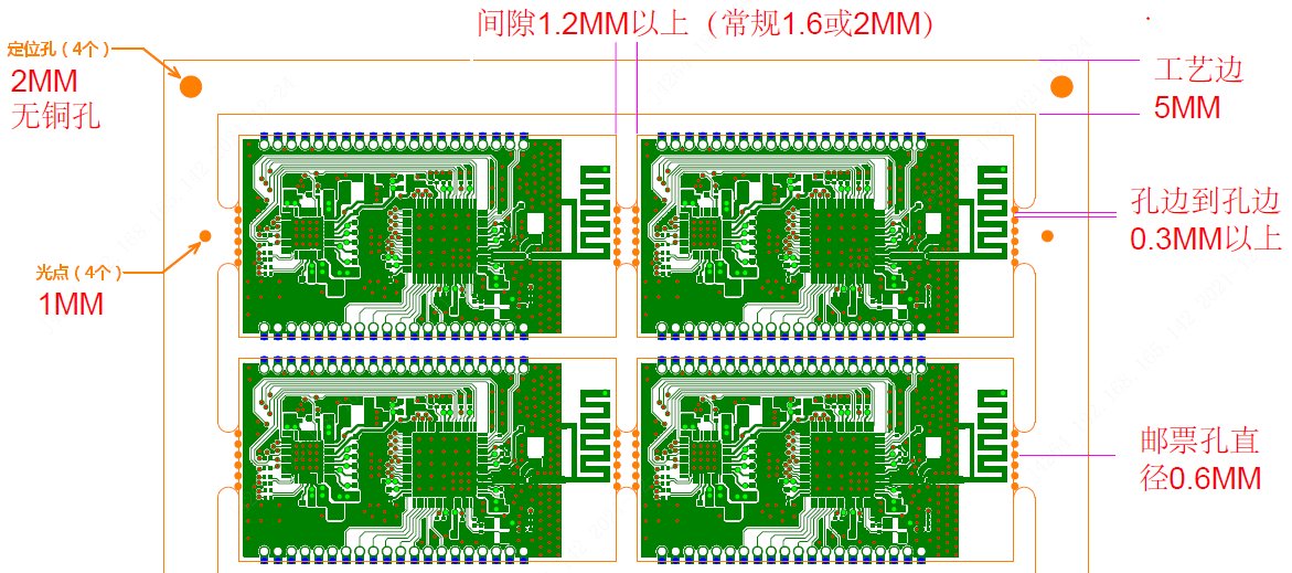 邮票孔拼板没有太多尺寸限制,最大尺寸不要超过制板的最大尺寸就行,为方便生产,建议拼板在300mm以内