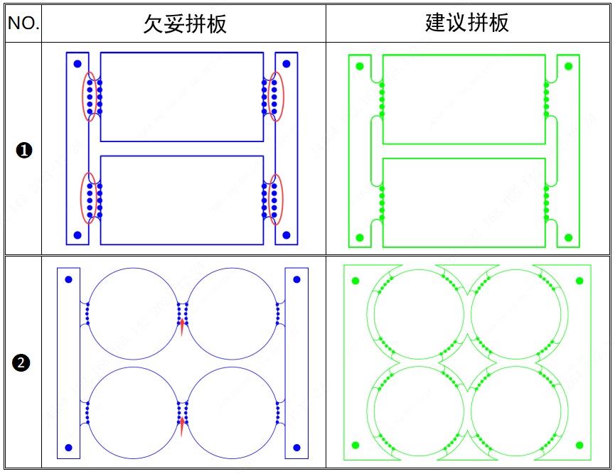 ① 客户提供的拼板文件中邮票孔间距不够的,我司工程将直接调到0.3mm以上处理(有足够的支撑才不会散落)且不会通知客户。