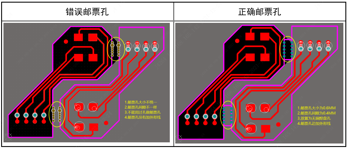 ■ 邮票孔位置:加在板框线的中心线或伸到板内1/3处 ,如板边有过孔、线路、安装孔及伸出元器件尽量避开