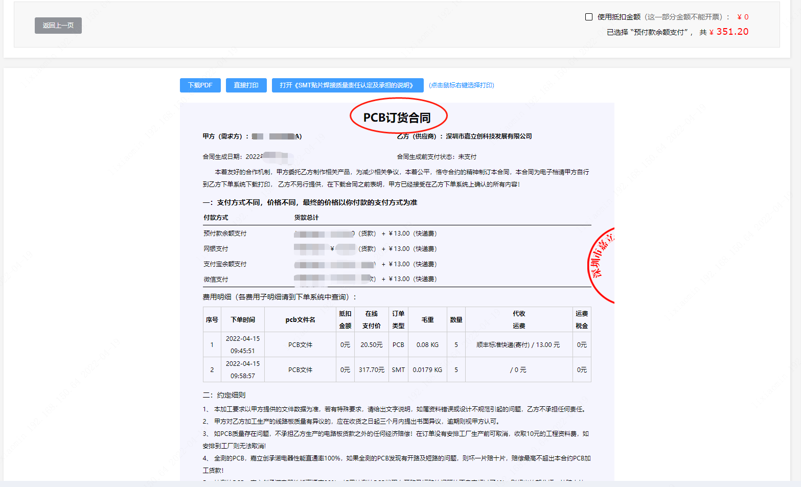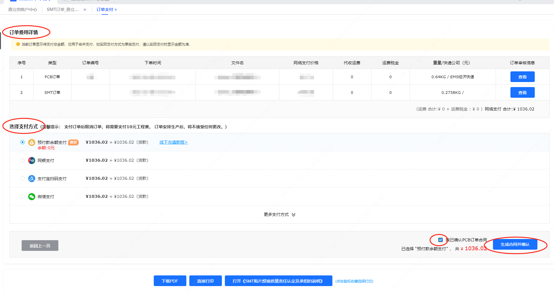 第七步:点击后会弹出上方为“订单费用详情”、下方为“支付方式”一起的页面框,注意核对网络支付费用并选择其中一种支付方式,点击“生成合同并去确认”,会在下方显示PCB订货合同,注意核对,确保无误。