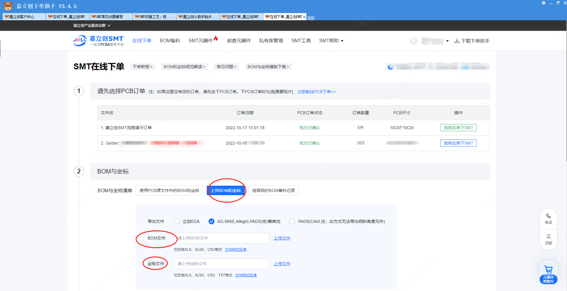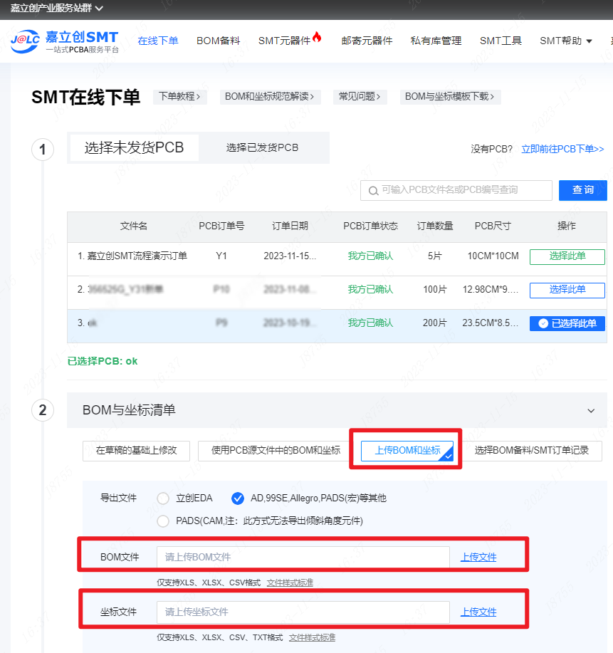 (注意:用PCB源文件下的PCB订单,系统会自动导出BOM与坐标,在下SMT订单可以直接用;系统没有导出的,方法一与方法二基本没用。)