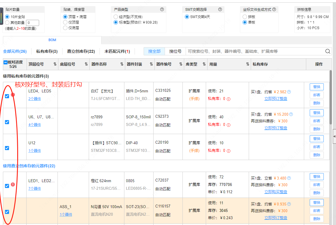 第三步:核对器件型号、封装无误后,在左侧方框勾选,确保全部勾选上,才能点击“备料完成,下一步”。