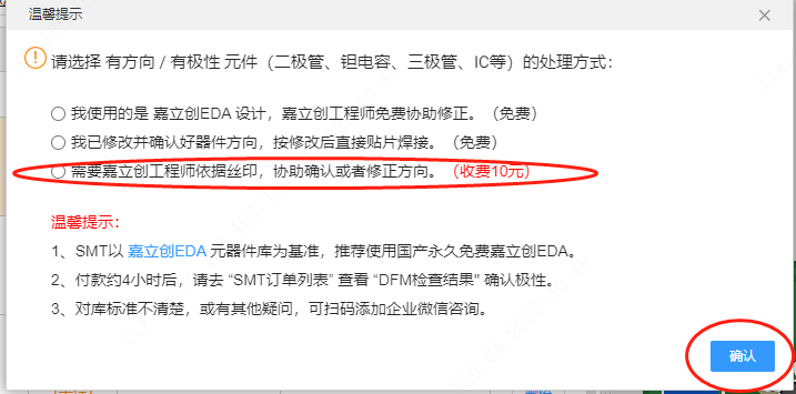 第四步:点击后会弹出温馨提示,您需要选择“”器件方向处理方式”,若您对器件方向不放心,可以选第三点(“需要 工程师依据丝印,协助确认或者修正方向。”,这点需要加10元费用),后点“确认“