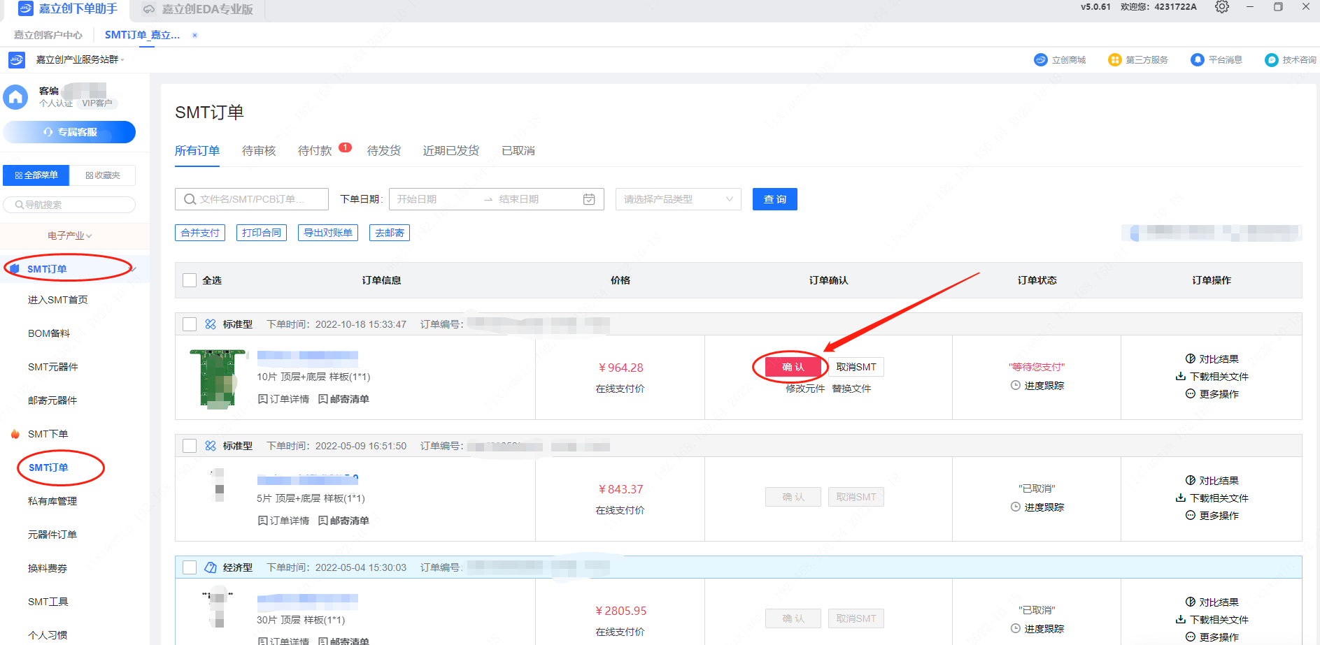 第六步:而后系统会回到主页面,点击【SMT订单】后,找到您刚刚下的订单,点击【确认】,