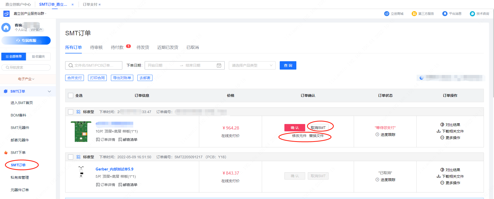 [温馨提示:付款后,在PCB订单还没有上线生产前,在”SMT订单列表”内可以“取消“ 或 ”修改“贴片订单。