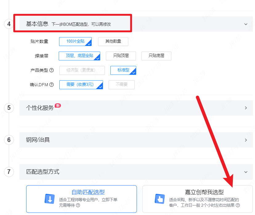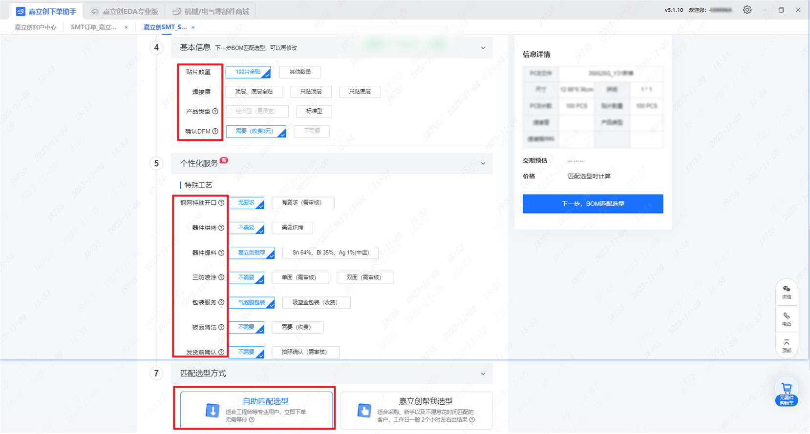 上传“BOM清单” 与 “坐标文件”(若没有这二份文件,BOM匹配详细介绍://m..com/portal/server_guide_19875.html),选择订单的基本信息,“贴片数量” “焊接层” “产品类型” “确认DFM” 如需要“个性化服务”可对应勾选,完成后点击“自助匹配选型”下一步,就可以匹配了。