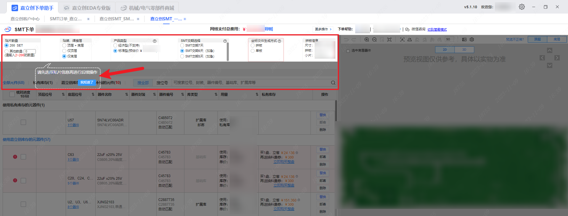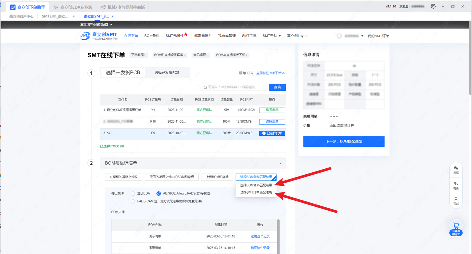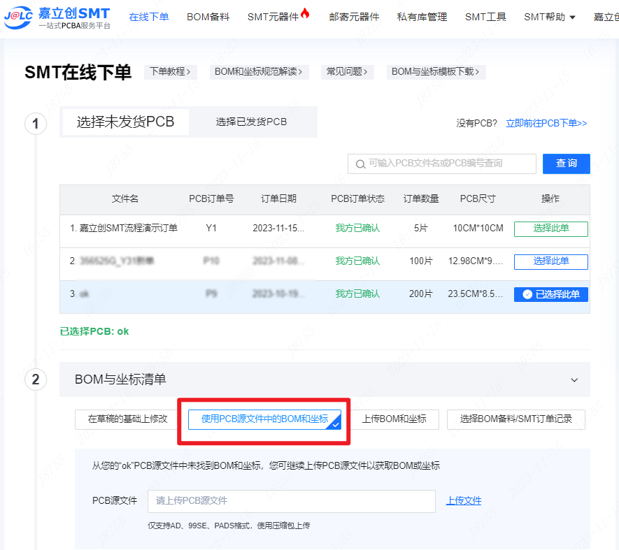 若您想下之前的BOM清单,可点击“选择SMT订单匹配结果”,选择您之前的BOM备料记录、或选择之前的SMT订单匹配结果,再上传坐标文件进行下单