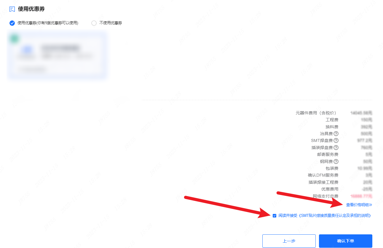 第五步:而后系统会自动跳转到SMT结算界面,这时要注意核对贴片位置、贴片数量,个性化服务信息,收货人信息等....确认无误后,再注意查看价格明细以及阅读《SMT贴片焊接质量责任认定及承担的说明》后,点“确认下单“。