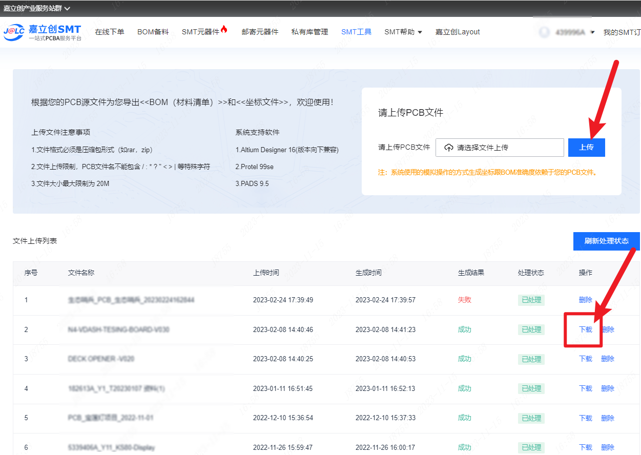 2. 可以用“SMT贴片工具“帮生成,对于处理成功的,下载后手动上传