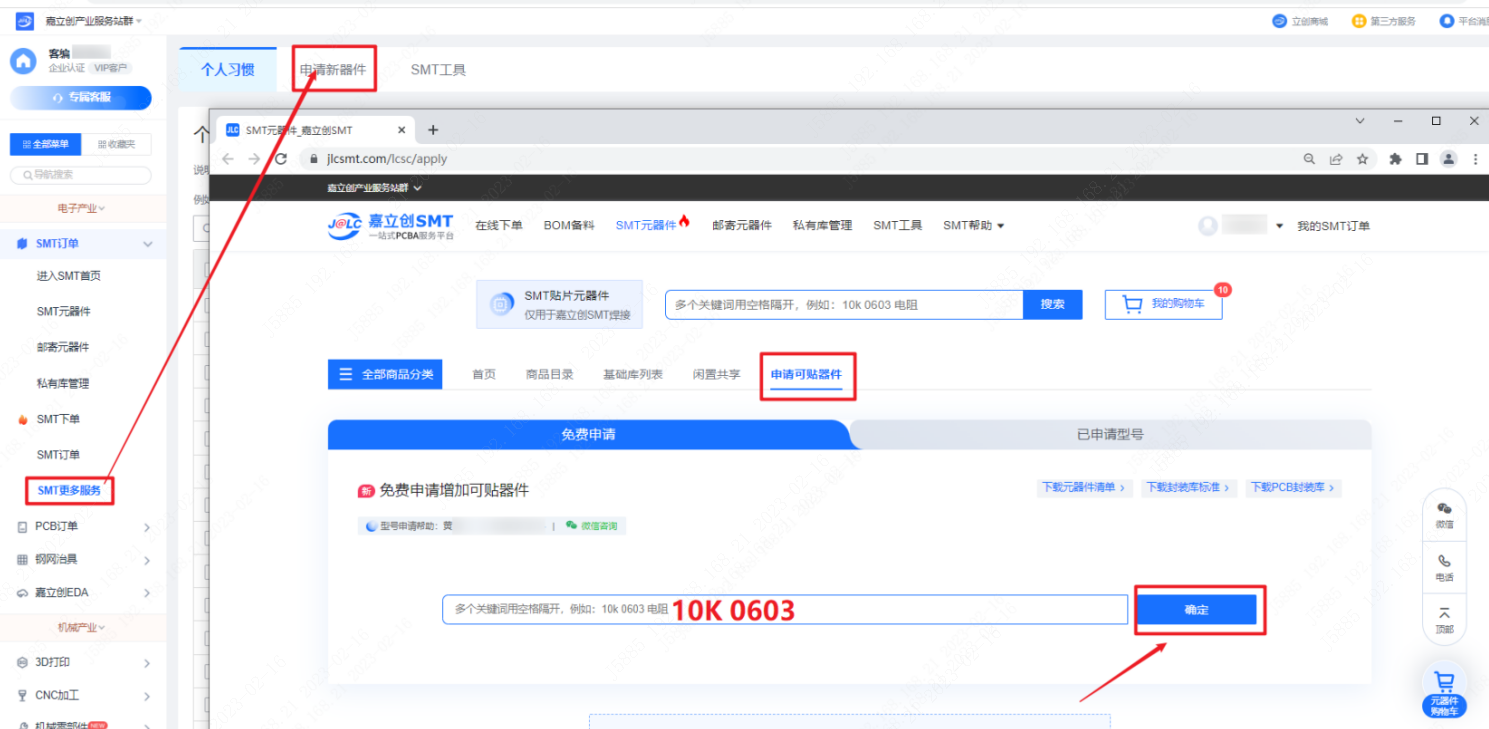 点击【SMT更多服务】---【申请新器件】---进入下个新网页,找到【申请可贴器件】按钮,在下方输入框内输入需要的器件型号点【确定】按钮。点【申请加入可贴列表】。