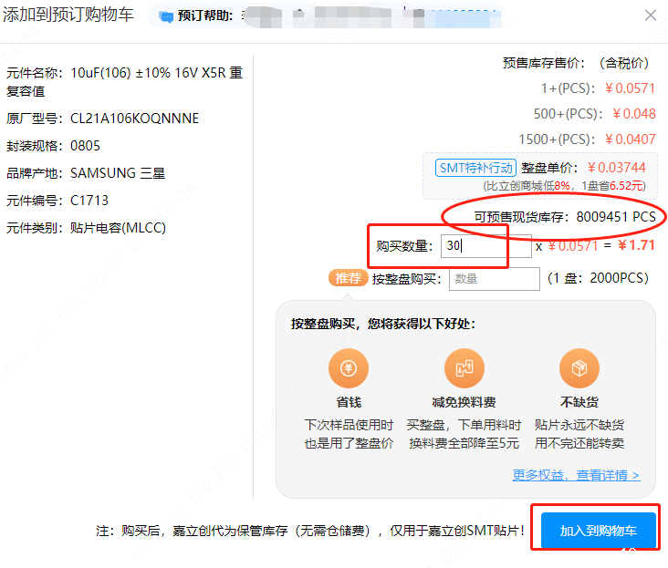 (2)在弹窗内输入需要的数量,数量 大于 “可预售现货库存”“为预订(期货,yyzx18需要询价、购买、器件入库后,客户下单匹配才可以使用)。