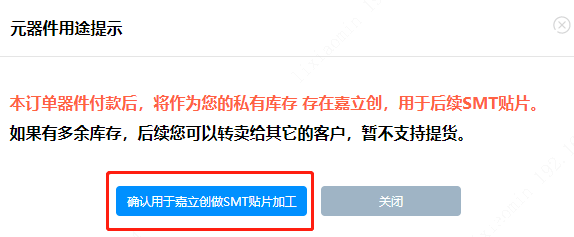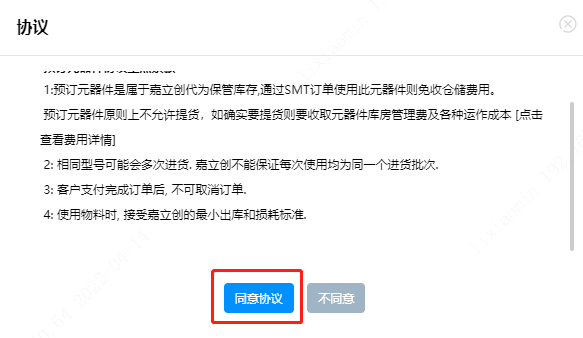 第五步:点击【提交订单】按钮后,会弹出【元器件用途提示】窗口,选择【确认用于yyzx18做SMT贴片加工】按钮。而后会弹出协议窗口,阅读并点击【同意协议】。