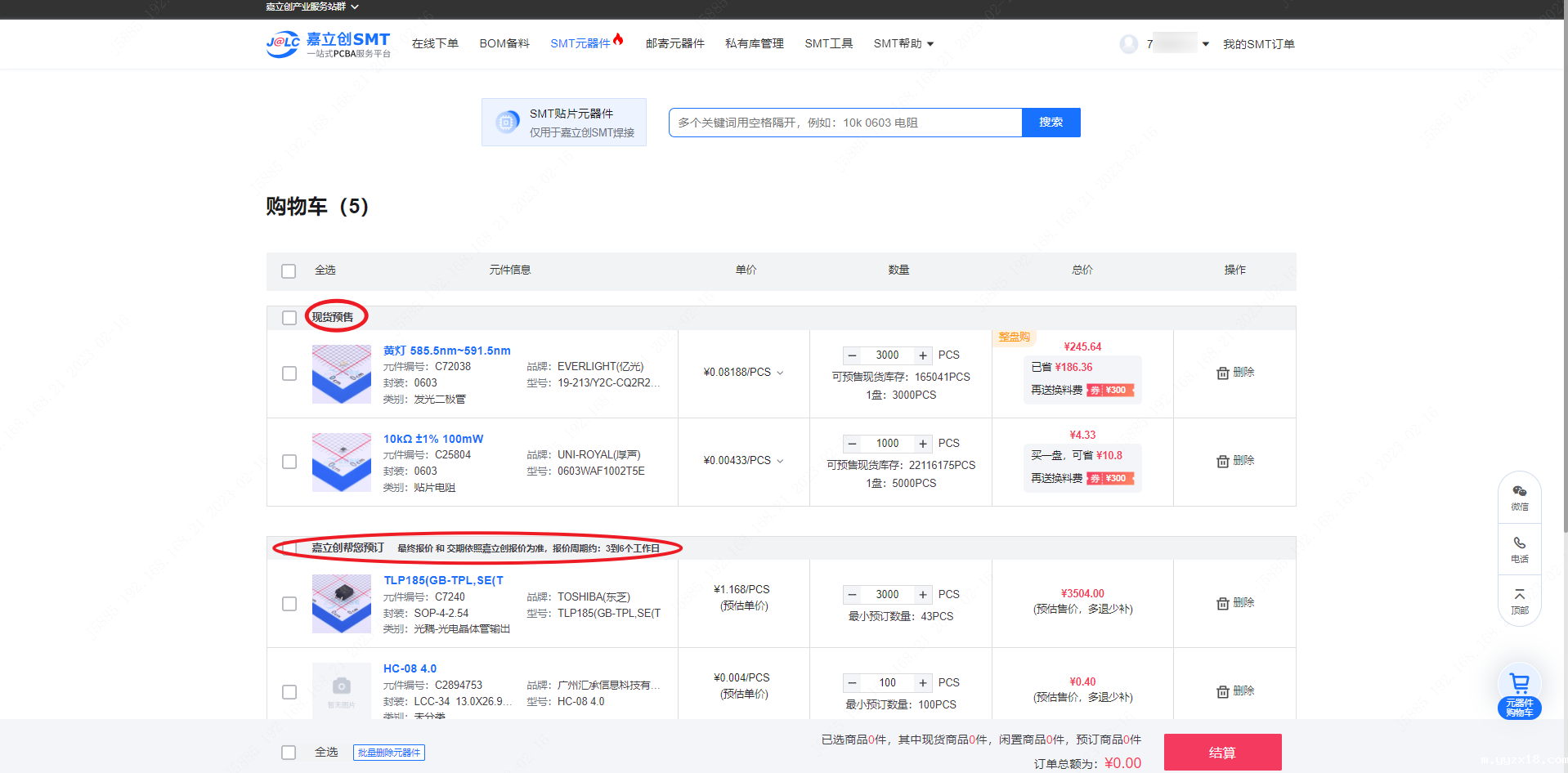 4.预订后,下贴片订单,使用样板的器件数量,享受批量器件的单价。