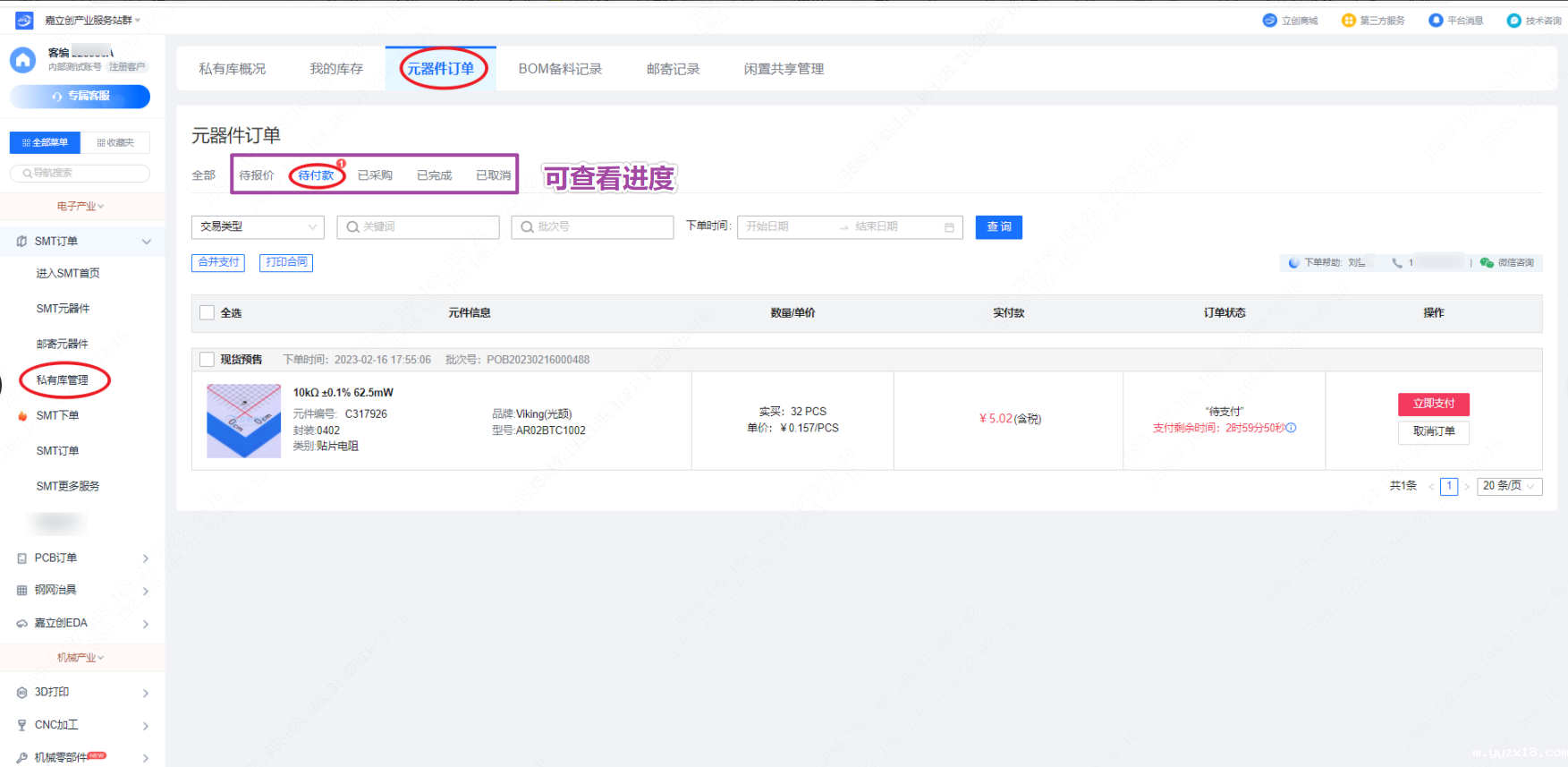 第一步:若想查看预订器件订单进度、费用,可以点击【私有库管理】,再点击【元器件订单】即可。
