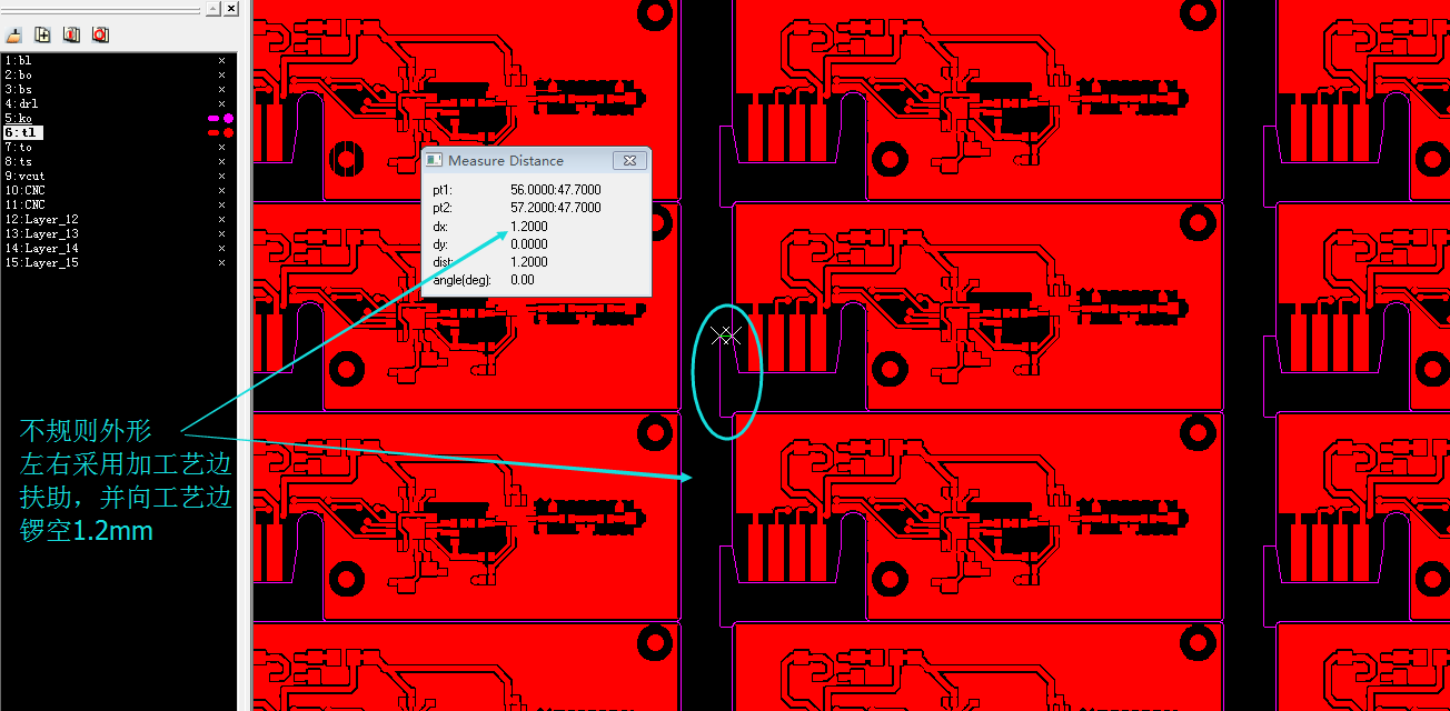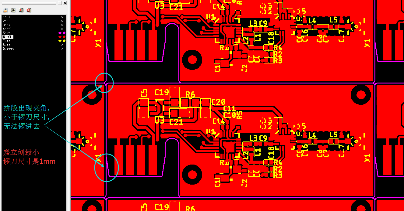 为了提高生产效率,采用连片拼板,但不规则外形常见错误,像有些小角度,斜角外形拼版出现夹角,小于锣刀尺寸它是无法锣进去。(槽刀最小尺寸1.0mm)//m..com/portal/server_guide_4110.html