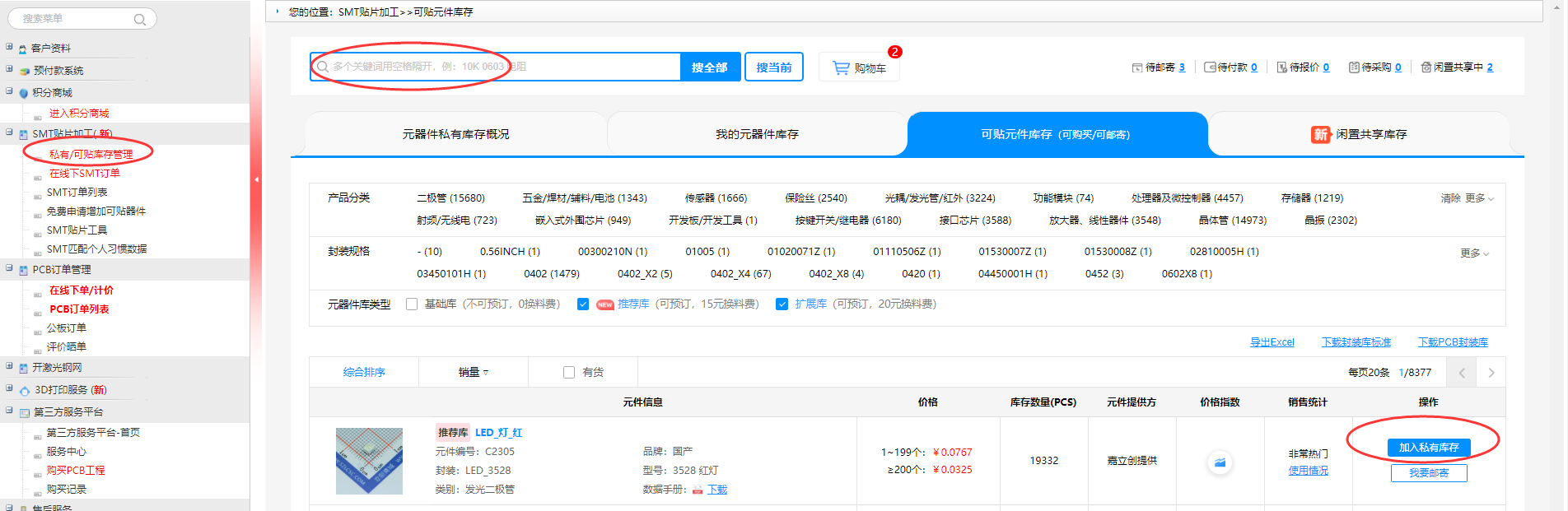 1.在“私有/可贴库存管理”内找到自己想要的型号,型号库存数量,点“加入私有库存”