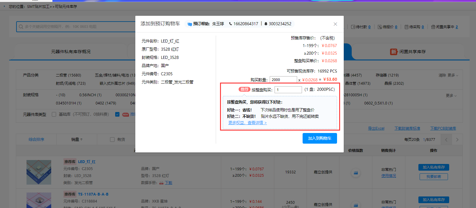 2.输入购买数量,加入到购物车(可预售现货库存:为0的,可以预订器件)