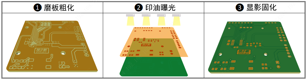 ② 整个板面印上阻焊油墨烘干后,把阻焊菲林盖在板面上,采用紫外线照射,没有阻焊图案挡住的油墨就固化在板面了,不能清洗掉