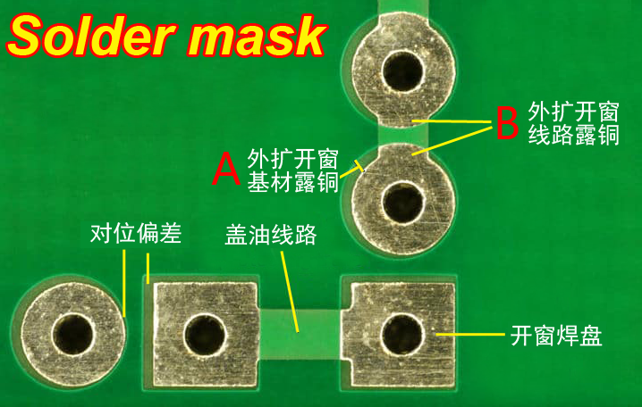在阻焊的制程过程中,因为机器的对位偏差,需要"阻焊开窗焊盘大于线路焊盘"(一般整体大0.1mm左右,即单边外扩0.05mm)。实际生产中就会出现阻焊开窗把一些焊盘做变形或是偏大,主要体现在: