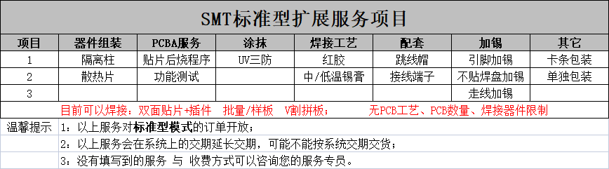 你们好!感谢大家对 贴片焊接的支持。为了能更好、更专业的服务您,近期我司新增加了关于标准型线下服务加工项目。目前具体可做的项目如下图: