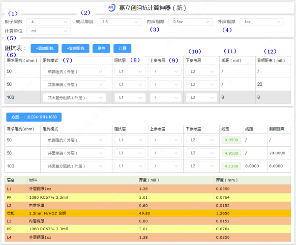 (16)计算:上面1-12项输入或选择后,点“计算”可计算出线宽及叠构信息