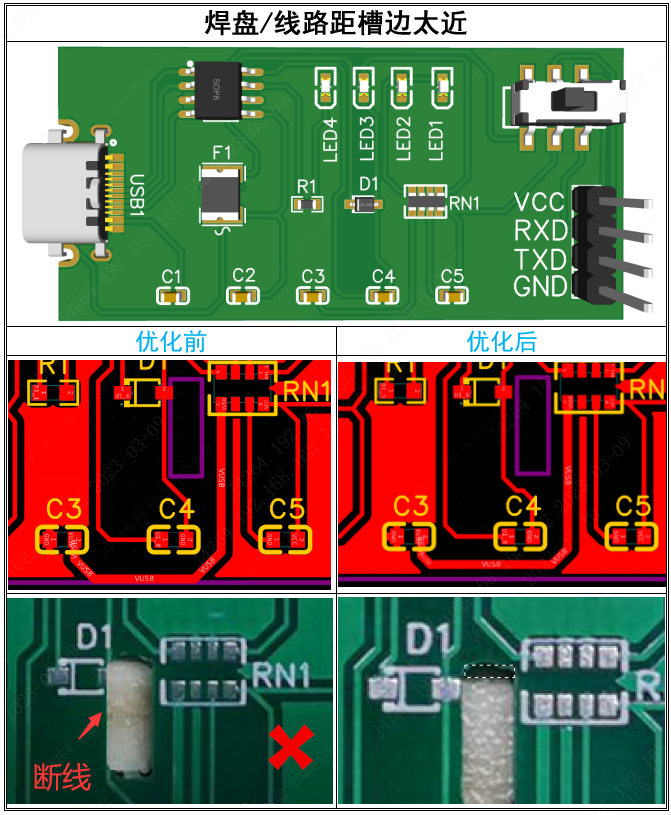 槽孔距线路/焊盘间隙太近,加工时出现"锣断线"、"锣伤焊盘"、"露铜"等品质不良问题